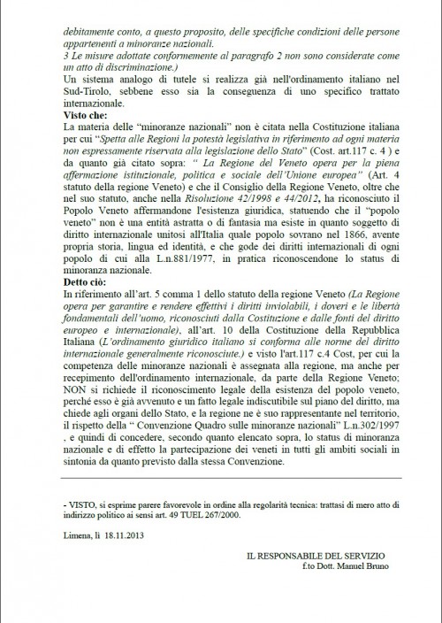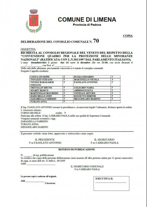 Limena chiede il riconoscimento legale del Popolo Veneto e vuole poter adottare il bilinguismo alla pari del Sud Tirolo.
