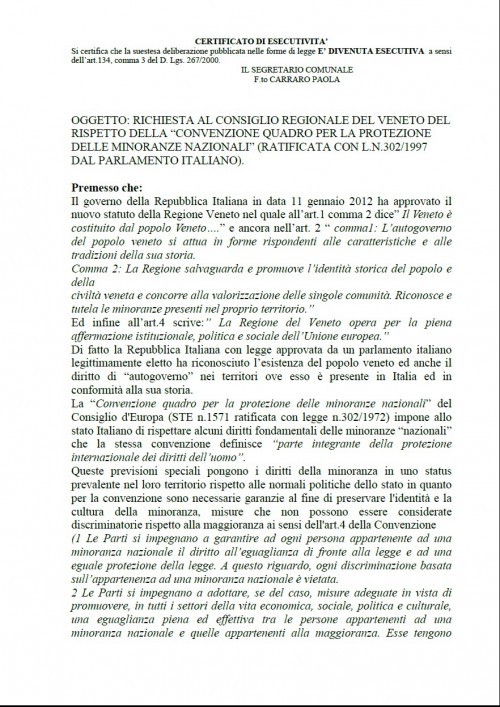Richiesta del rispetto della "Convenzione quadro per la protezione delle minoranze nazionali"